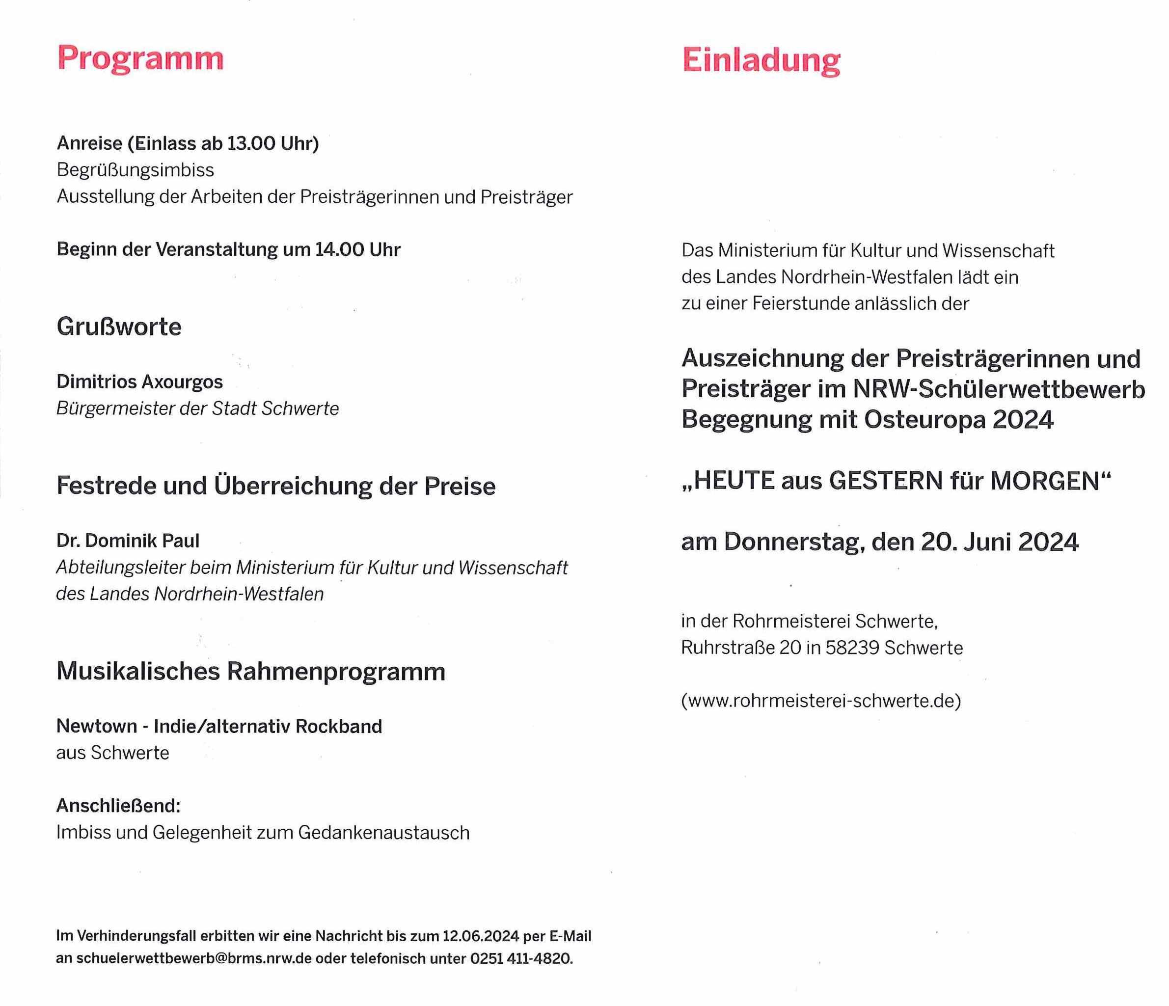 Johann Ceglarek, der Bundeskulturreferent der LdO sowie stellv. Bundesvorsitzender folgte der Einladung des Ministeriums für Kultur und Wissenschaft de Landes NRW zur Teilnahme an der 71. Preisverleihung im NRW-Schülerwettbewerb "Begegnung mit Osteuropa 2024" in Schwerte am 20 Juni 2024.